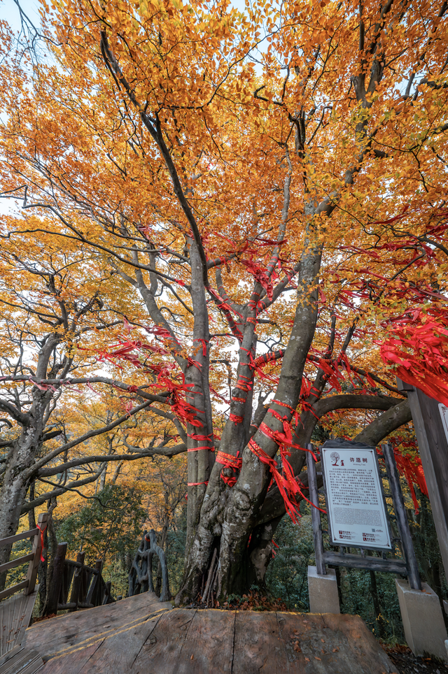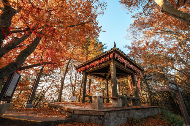 亭子的横梁上挂着红色的祈福绑带,非常醒目,让这林间更显宁静祥和,氛围感直接拿捏!随便咔嚓,都没有废片~