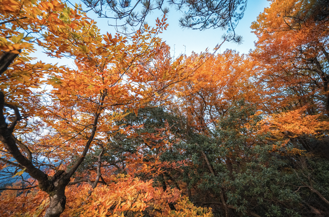 山上的红叶从深绿渐变到绯红,却叫你看不出一丝违和的痕迹,秋季的燕子岭将色彩带入了云端,你可以看到奶白的云朵、鎏金的阳光,和华彩交织的层林和谐展现,坠入万花筒中的七彩世界。