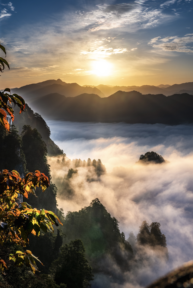 光雾山境内还有一处高空赏红叶的绝佳之地——香炉山。特别是晨景,那叫一绝,太阳初升时分,香炉山顶缭绕的云雾仿佛燃起的缕缕青烟,遇上秋季,明艳的色彩搭配上飘飘“仙气”,云里雾里的,完全是动漫里才有的场景。