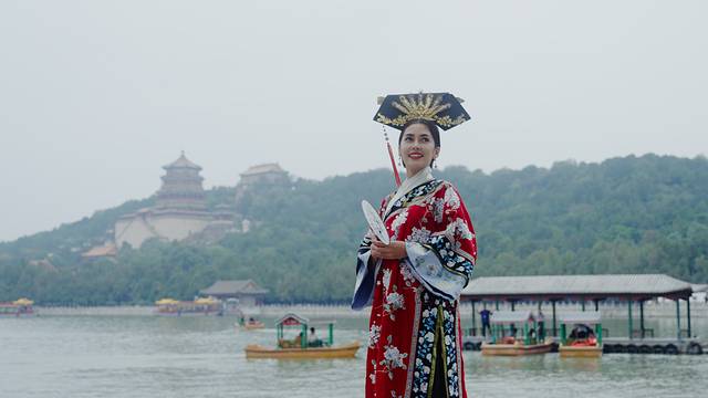 烟雨迷蒙的颐和园,迈着轻快的步伐,对相机展露笑容。红色的宫装随风摇曳,影子倒映在湖面,仿佛置身于画中,此情此景真是美不胜收!同时也收获了人生照片!