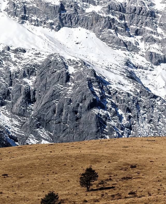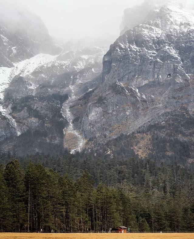 云杉坪在山脚下,适合有高反的人去。这里是云杉林、草甸、小木屋和雪山的结合,下雪的时候绝美。