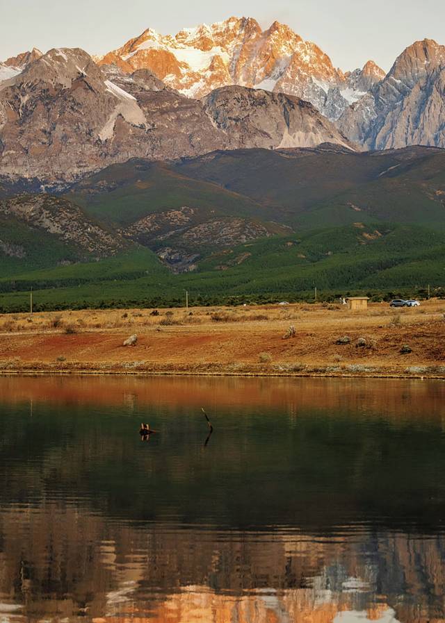 在这里可以 FREE看日照金山,还能拍到雪山倒映在水中的镜像,。丽江的冬天都是快八点才日出,不用起太早。