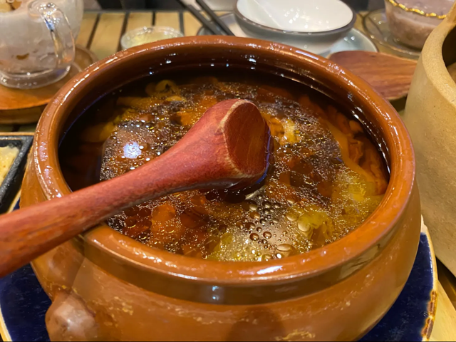 其实是菜品,真的很出彩,我们点的普洱茶红烧肉,汽锅鸡,包浆豆腐,丽江粑粑还有果酒都很好,没有一道菜踩雷,味道挺不错的!非常值得一吃!