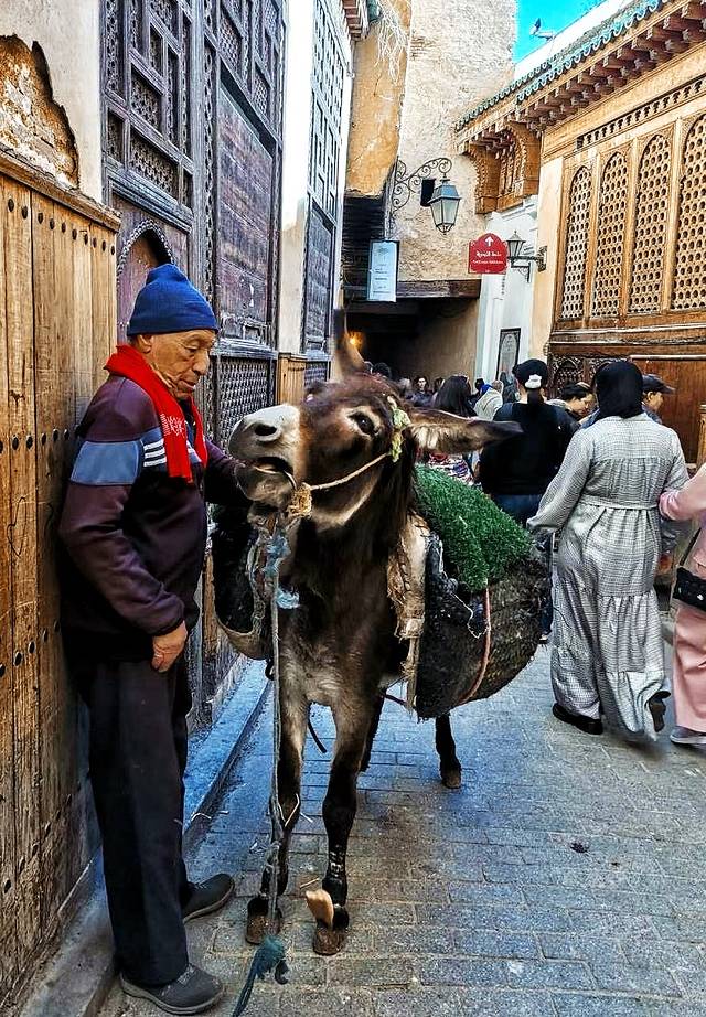 夕阳洒在菲斯古城狭窄的石板巷道上,一位满脸皱纹的老人牵着满载货物的驴缓缓前行,驴蹄敲击石板发出清脆声响,静谧又充满故事感的画面定格在古老岁月中。