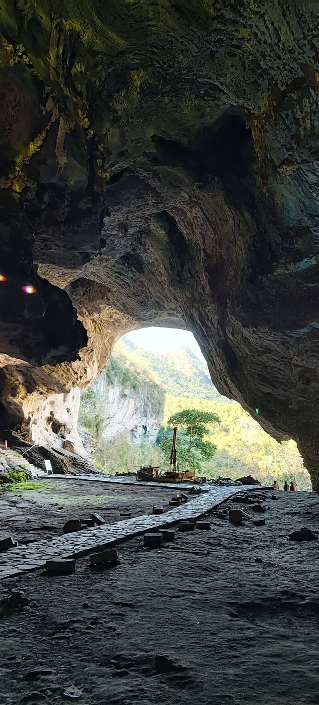 皇帝洞藏在昌江县王下乡牙迫村东南边,就在昌化江支流南浇河和洪水河交汇的地方,离县城石碌镇60公里,离霸王岭也不远,就20公里。洞宽60米,深130米,高25米,里面面积有7800平方米,跟个大型体育馆似的,能装下上万人!